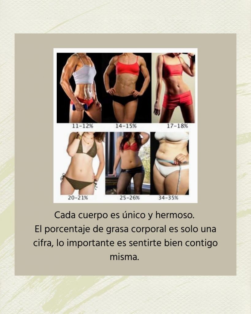 - Porcentaje de grasa corporal: Cantidad de grasa en relación con el peso total.